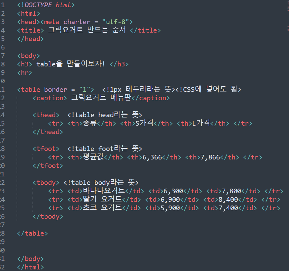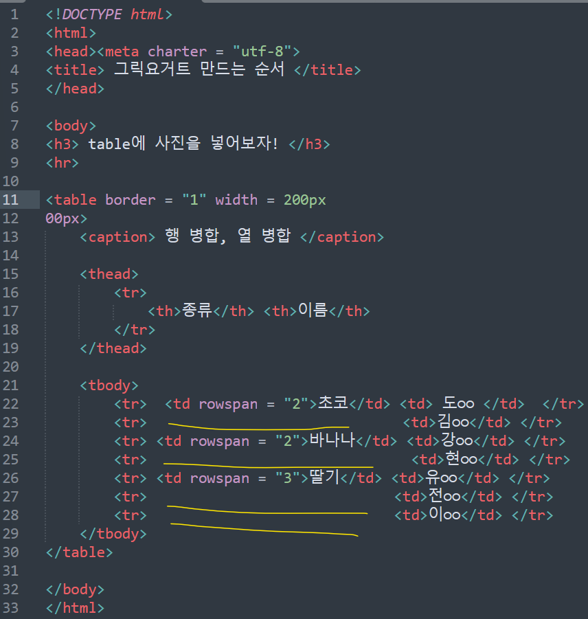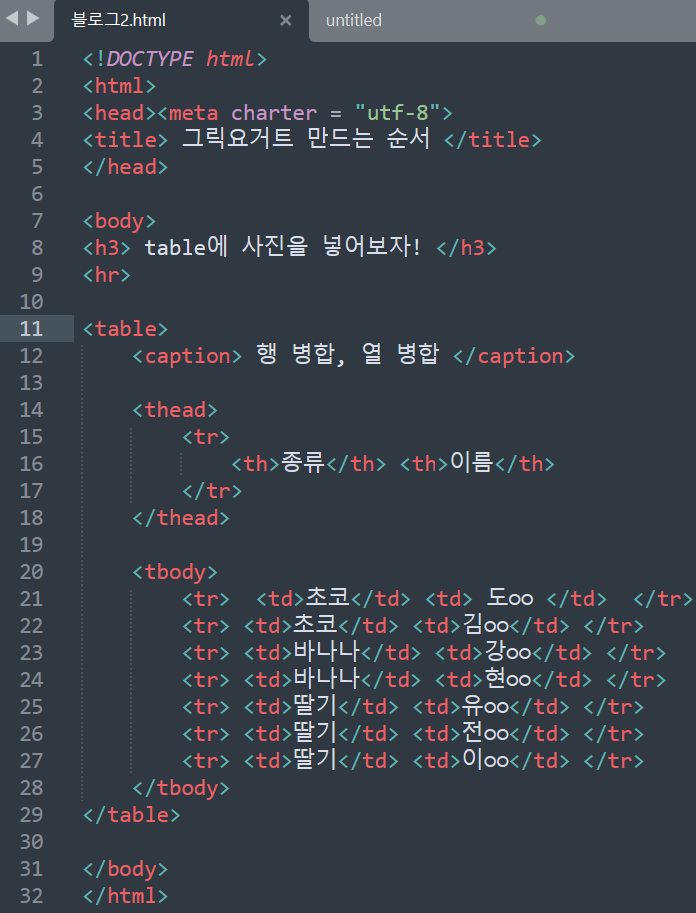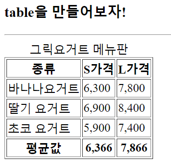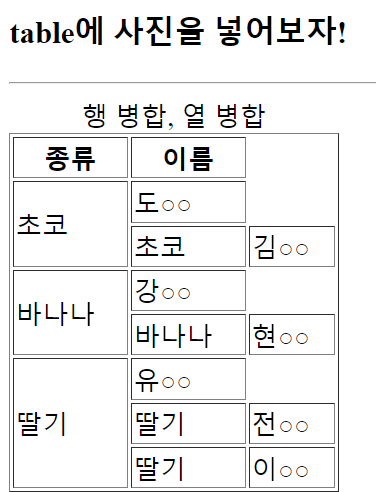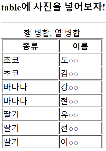 <tr> <td>종류</td> <td>이름</td> <tr> 이렇게 작성하였습니다. (tr은 묶음, td는 데이터 ㅇㅇ)