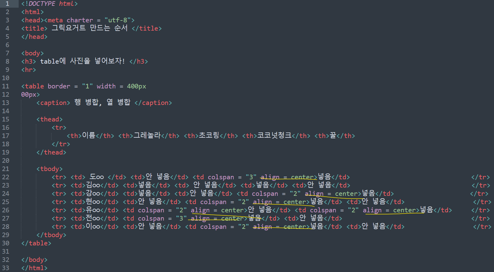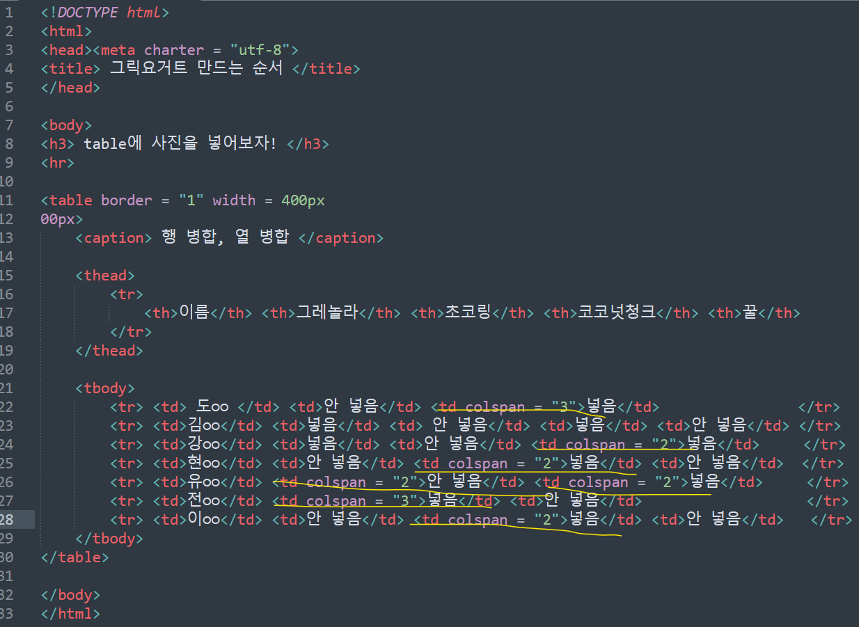 열음 <td colspan = 숫자> ~~~ </td> 으로 작성합니다