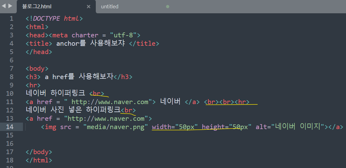 2) 다른 웹 사이트의 웹 페이지 하이퍼링크 <a href = "http://www.naver.com"> </a>