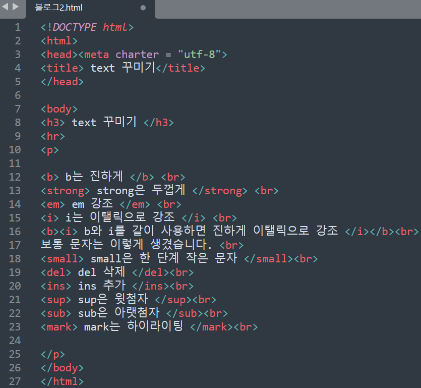 텍스트의 크기, 굵기, 글씨체 등을 바꾸는 태그를 사용해보도록 하겠습니다.