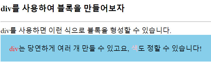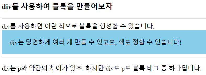 <div>는 <p>와 비슷하게 사용할 수 있습니다. 둘 다 단락을 나눠줘요.